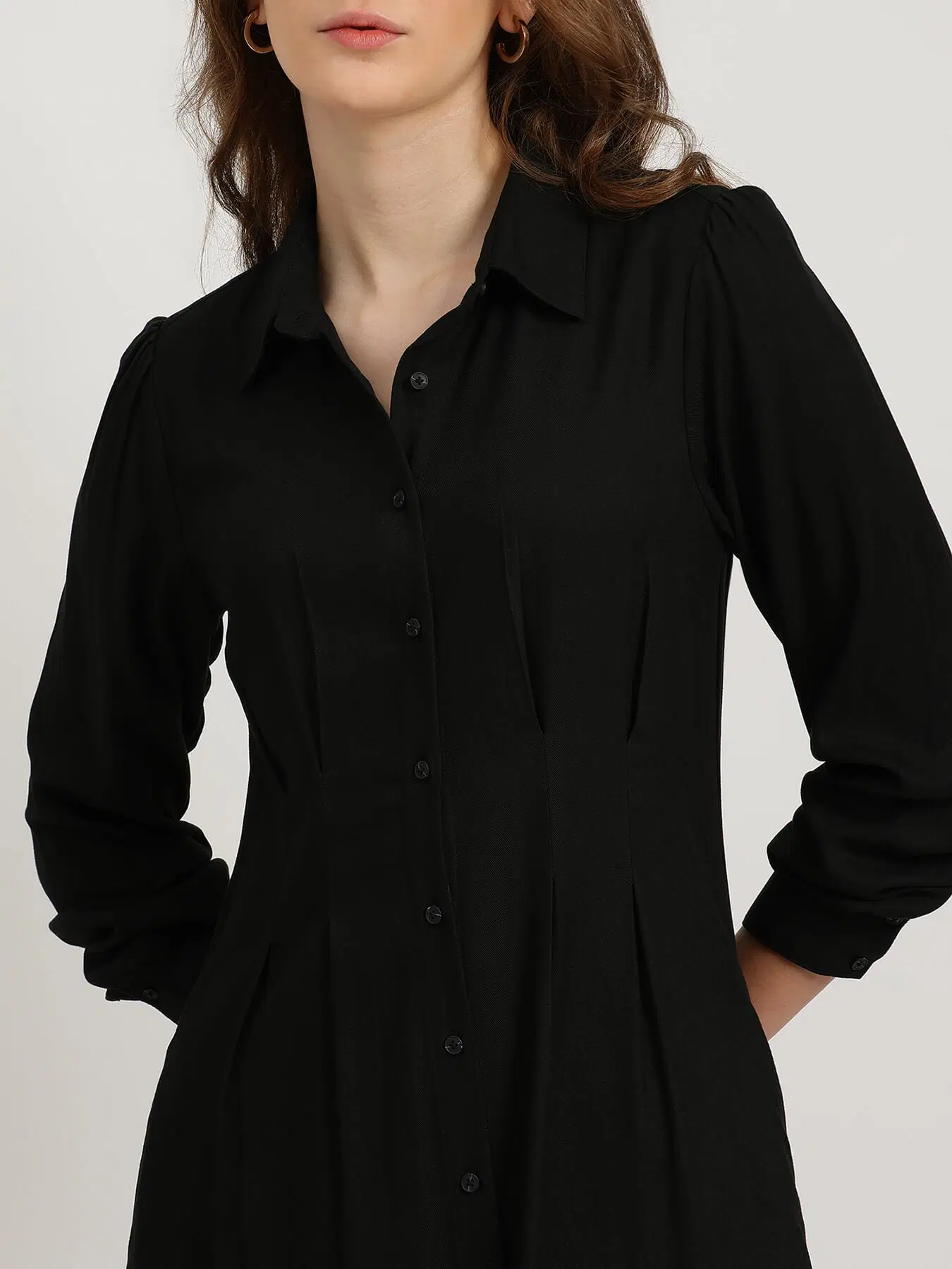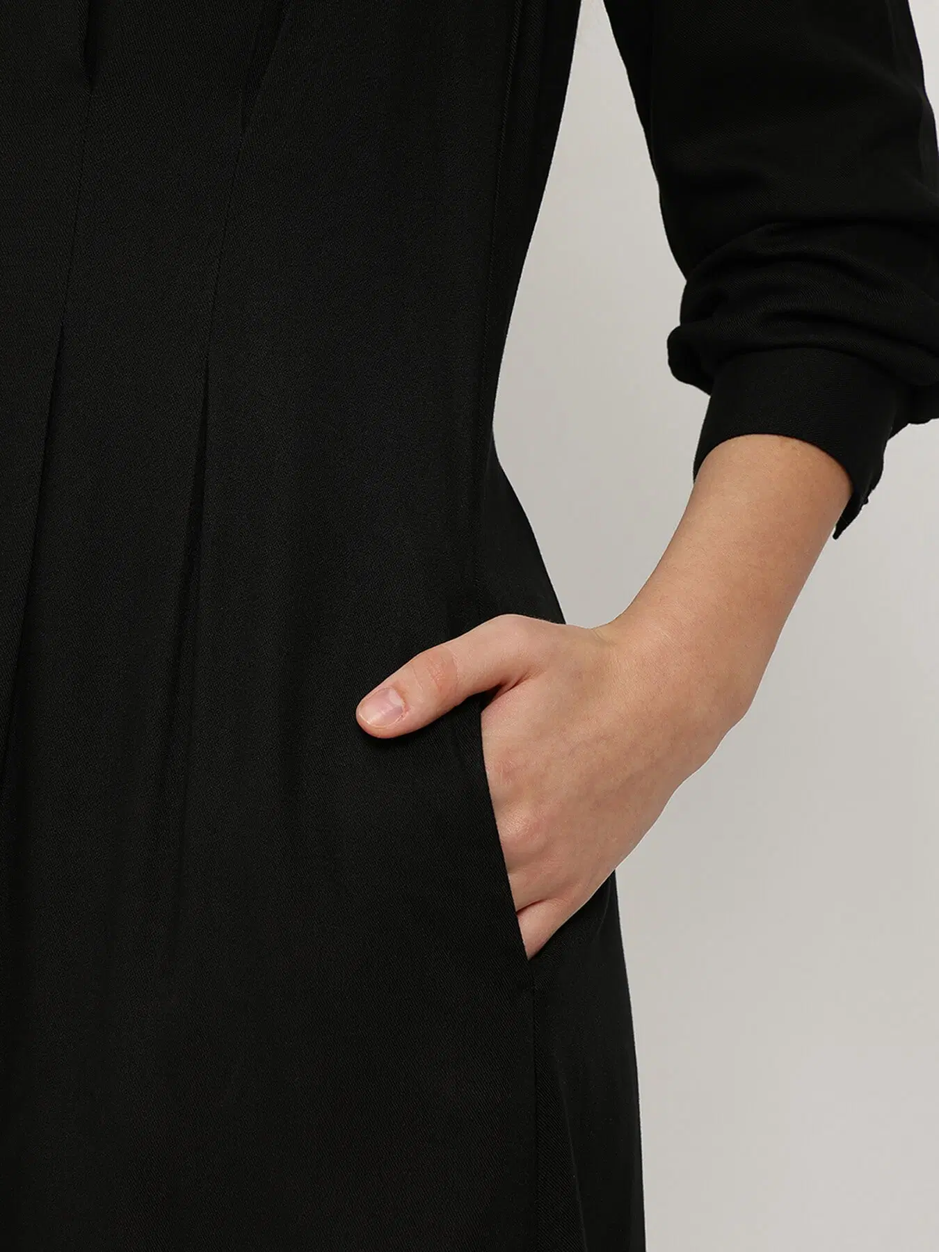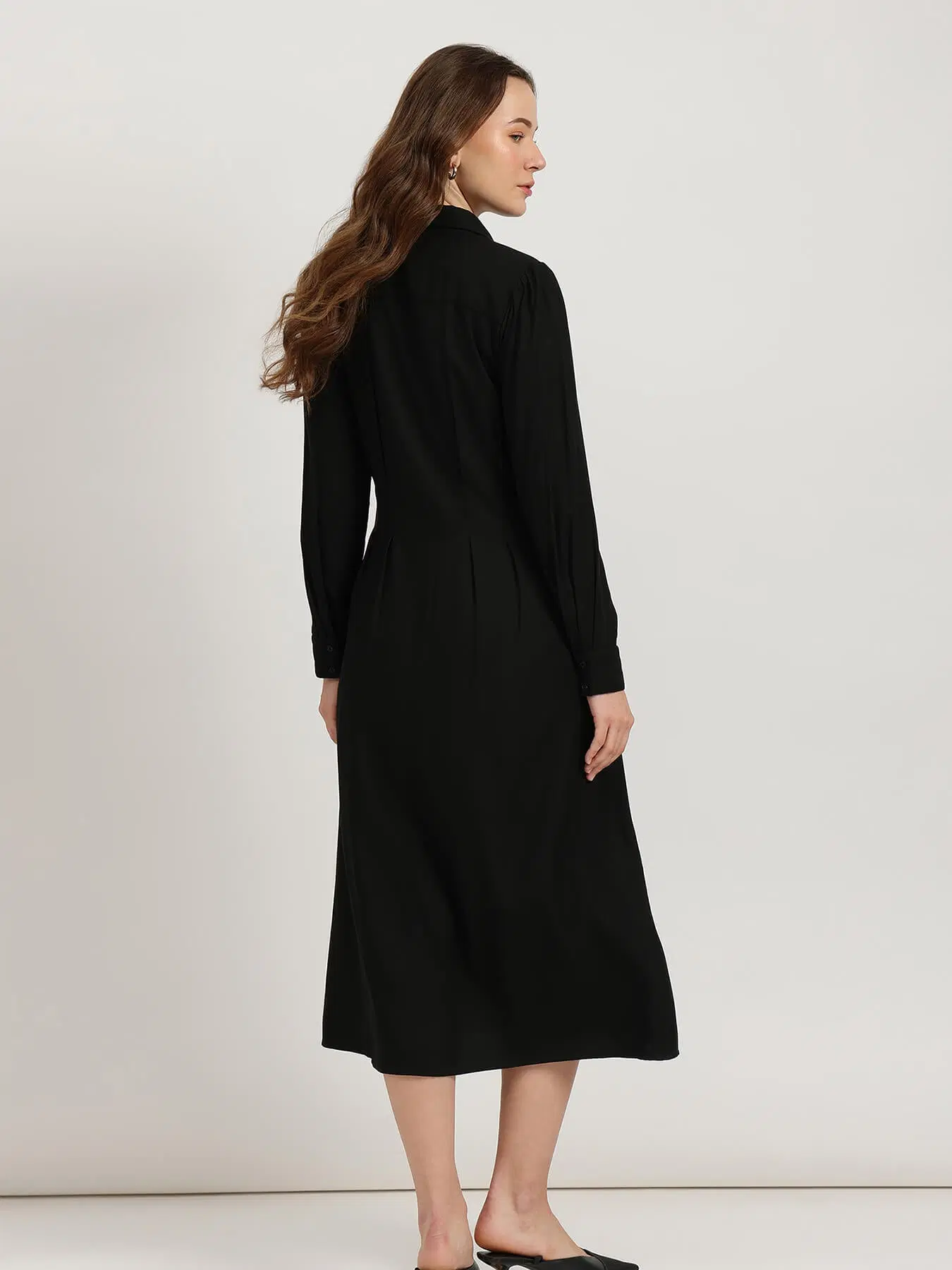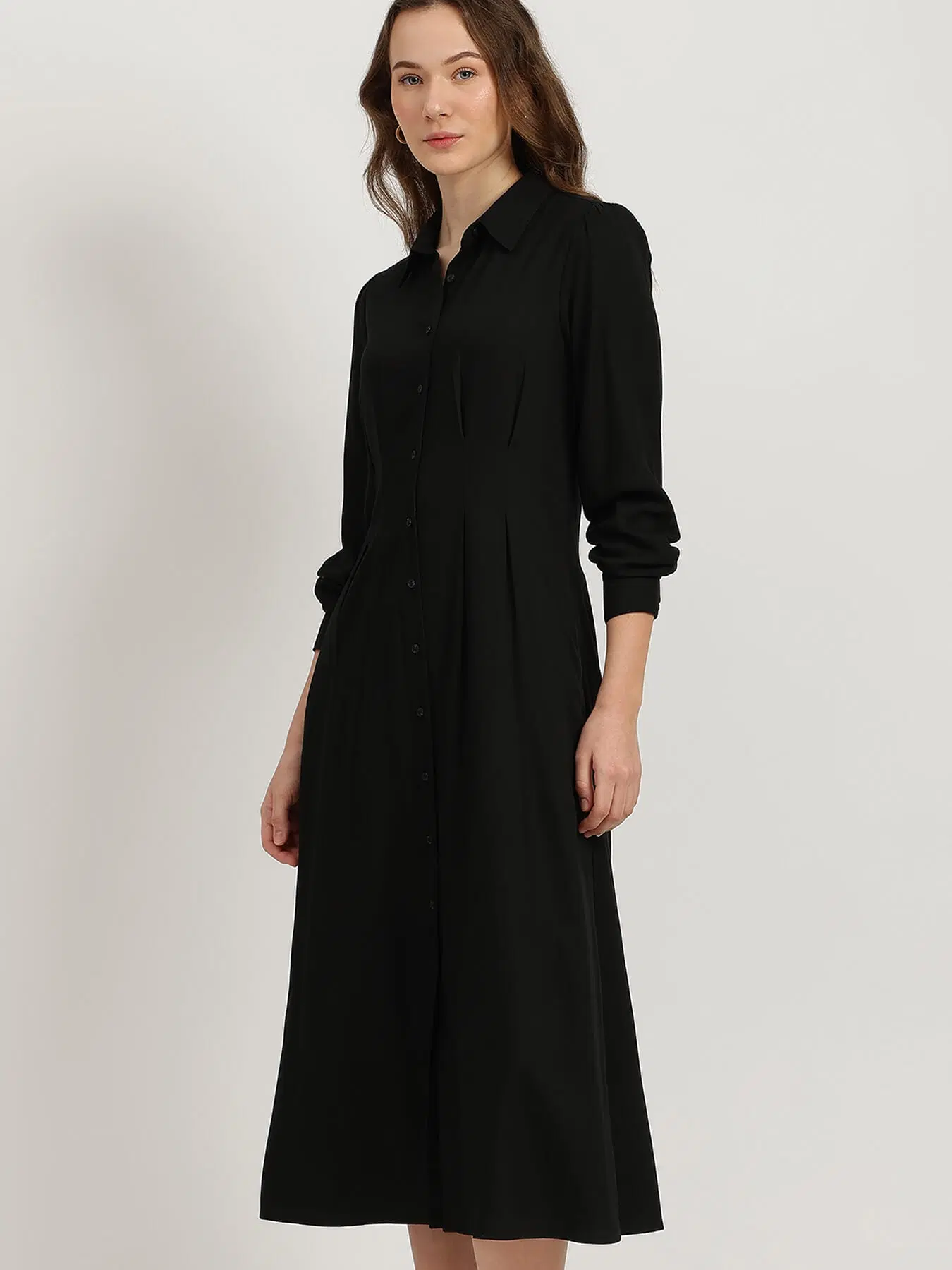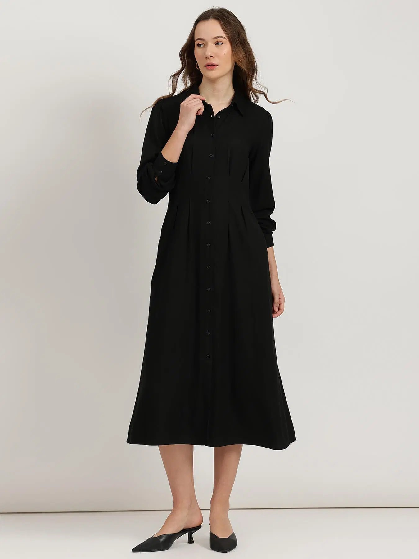 comfort, and timeless style. Crafted from premium-quality fabric, this dress offers a smooth, lightweight feel that’s perfect for year-round wear. The classic black hue adds a touch of understated elegance, making it a versatile piece that seamlessly transitions from office wear to evening outings. With its minimalist design and refined detailing, this shirt dress embodies effortless chic — a must-have staple for every modern woman’s wardrobe.