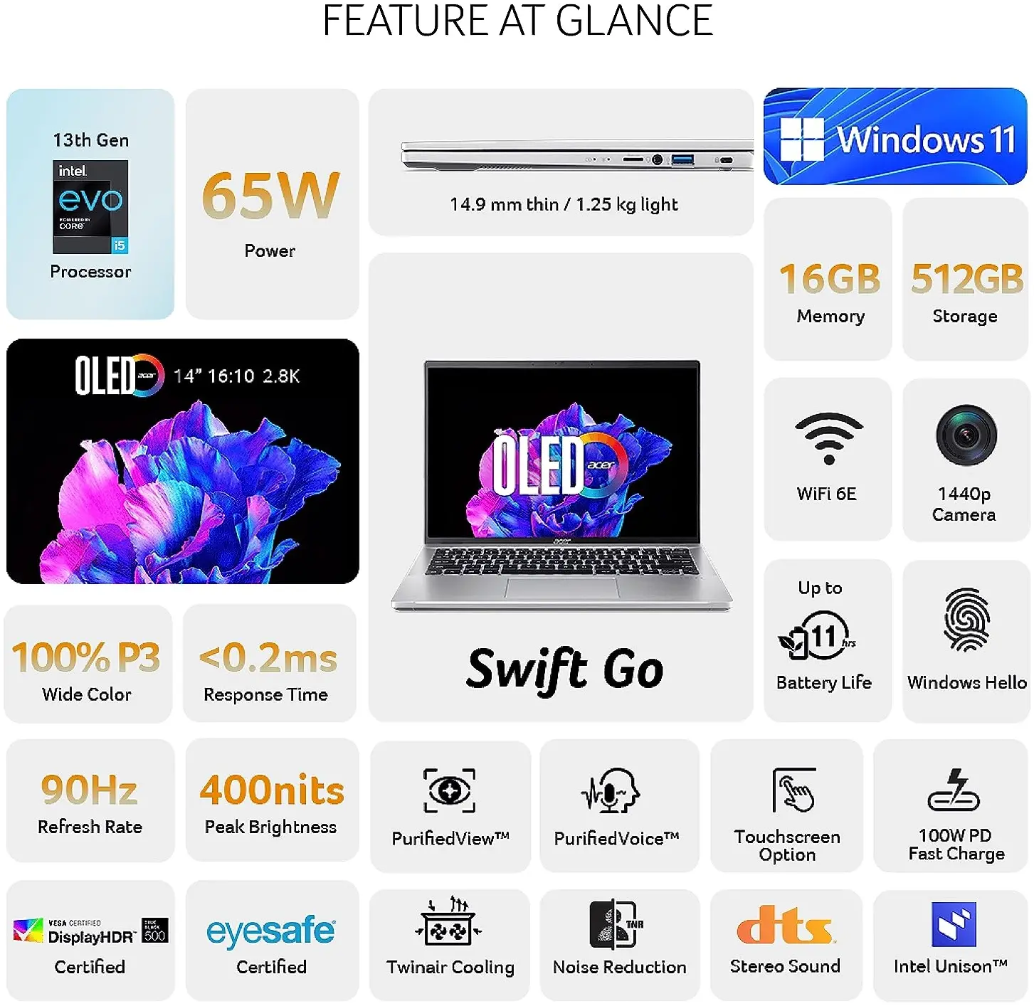 At its core, the Acer Swift Go is powered by the 13th Gen Intel Core i5 processor, offering powerful and efficient performance for a wide range of tasks. Whether you’re working, studying, or enjoying multimedia content, this laptop ensures smooth and responsive operation.