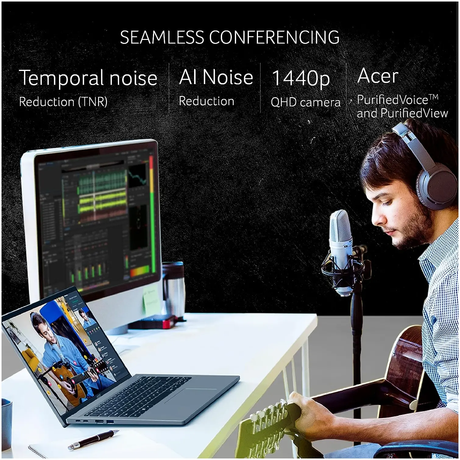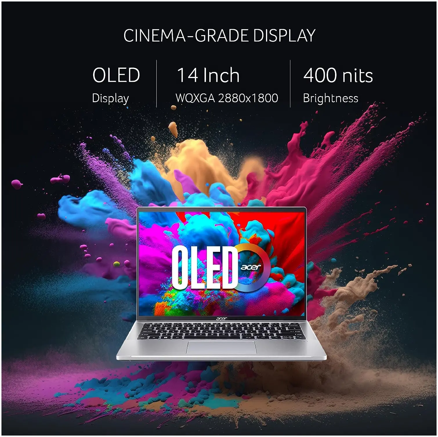 - Display: 14.0″ display with OLED (Organic Light-Emitting Diode) technology, WQXGA+ 2880 x 1800, high-brightness (400 nits) Acer CineCrystal, 16:10 aspect ratio, color gamut DCI-P3 100%, Wide viewing angle up to 170 degrees, Mercury free, environment friendly