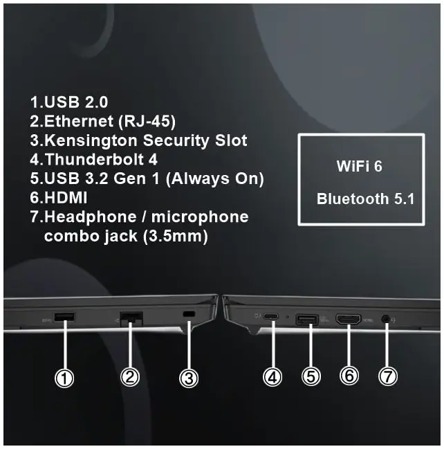 - Ports: USB 2.0, USB 3.2 Gen 1 (Always On), Thunderbolt 4 /USB4 40Gbps (support data transfer, Power Delivery 3.0, and DisplayPort1.4), HDMI, Ethernet (RJ-45), Headphone/microphone combo jack (3.5mm) l Monitor Supports: up to 3 independent displays