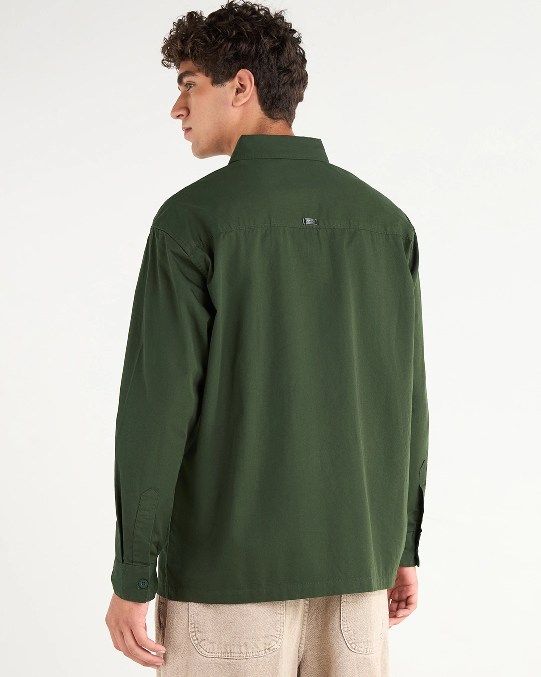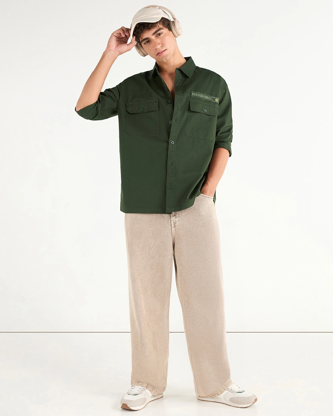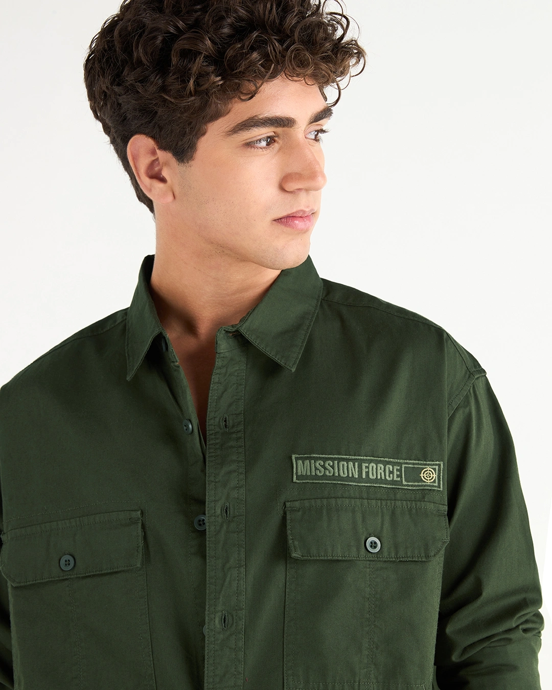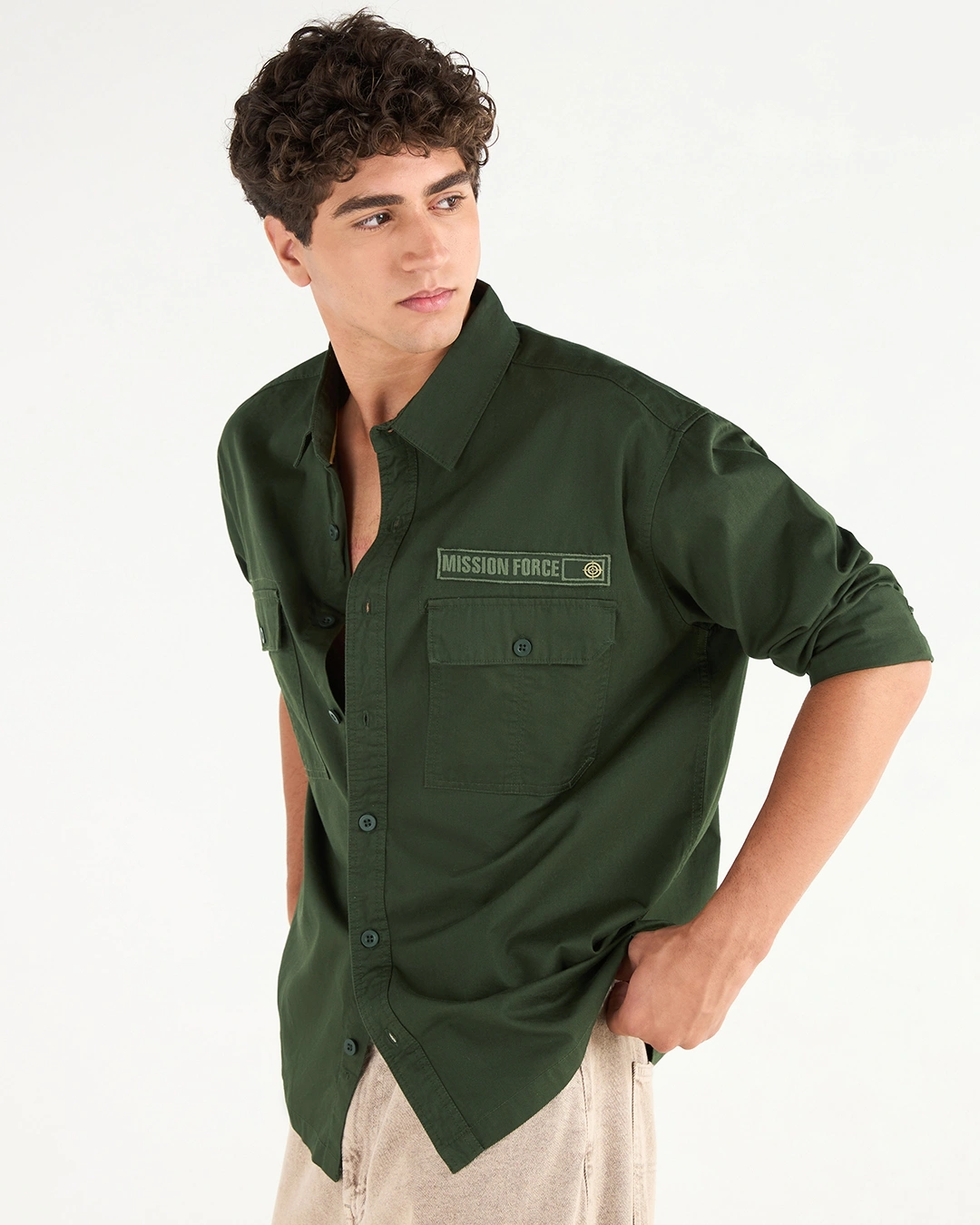 Men’s Dark Green Mission Force Batch Printed Oversized Cargo Shirt