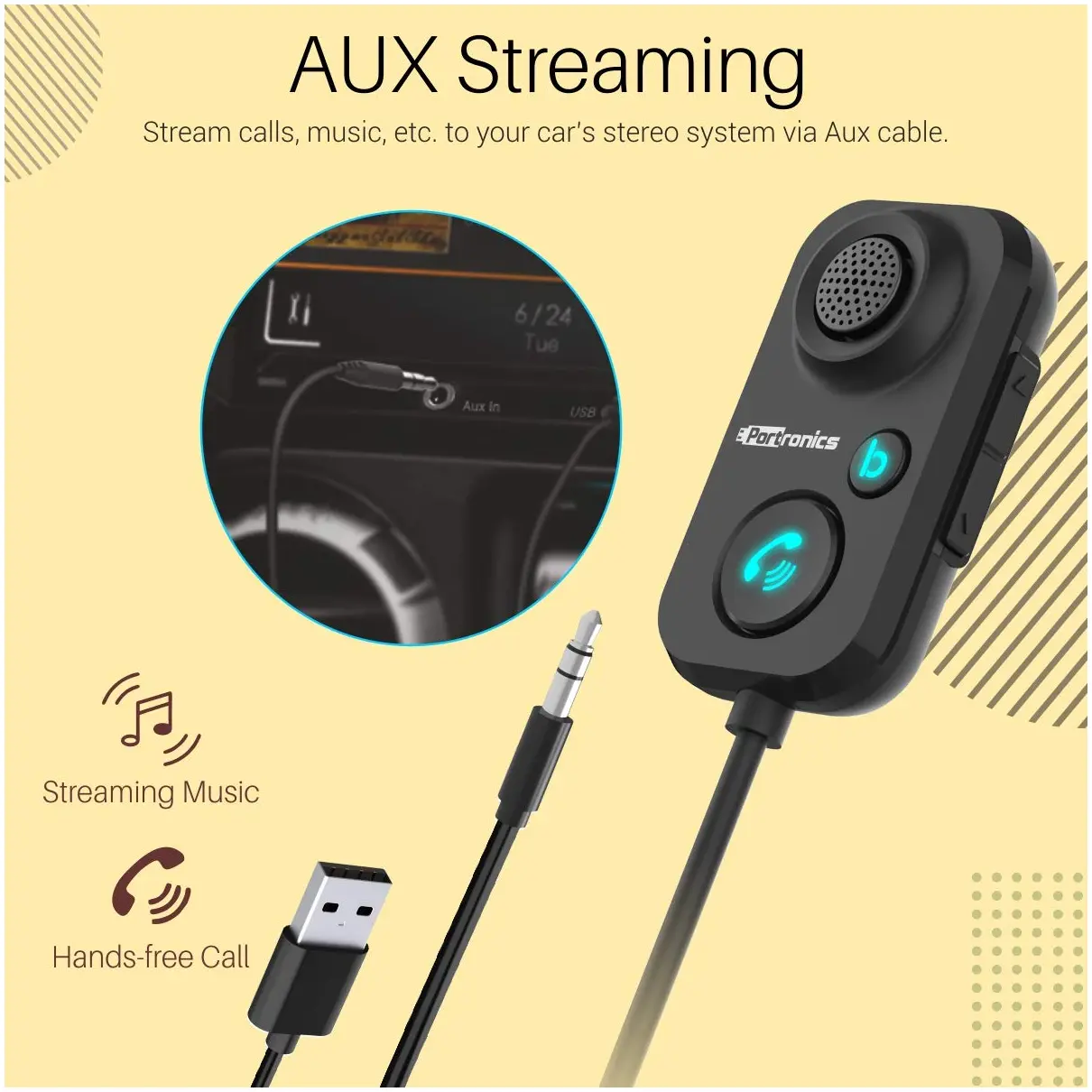 - [STREAM WIRELESS MUSIC] : Now turn your non-Bluetooth car stereo system into Bluetooth simply with the Auto 12. This wireless gadget is designed to let you stream music from your phone to your car stereo system, without the hassle of wires. Also, make/receive phone calls, all with crystal clear sound directly in your car.
