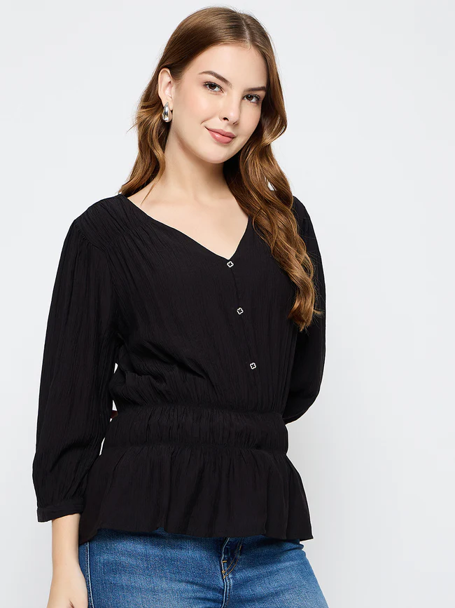 The Rayon Blend Black Peplum Top features a tailored fit through the bodice that seamlessly transitions into a flared hem, giving it a structured yet fluid appearance. Its lightweight and smooth texture ensures all-day comfort, while the natural drape of the rayon blend fabric adds a touch of effortless elegance. The top can easily be styled up or down β pair it with slim-fit trousers or pencil skirts for a chic office ensemble, or with jeans and heels for a smart-casual evening look.