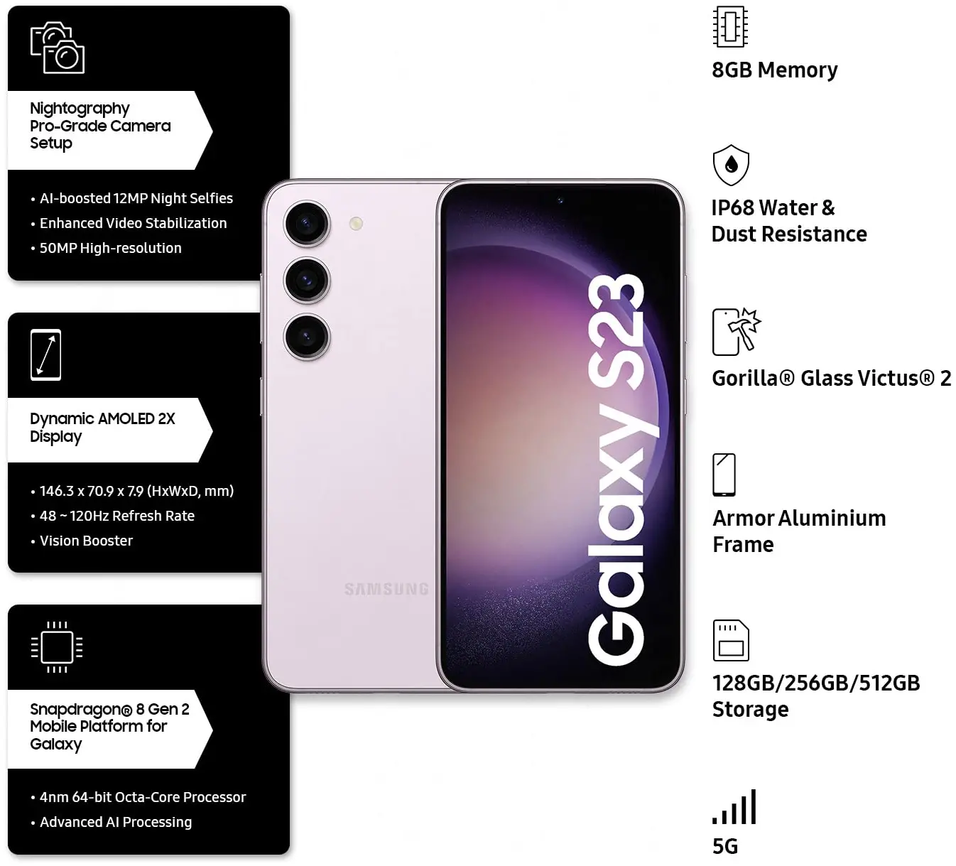 Samsung Galaxy S23 5G in the soothing Lavender color variant, featuring a substantial 8GB of RAM and an expansive 256GB of storage.