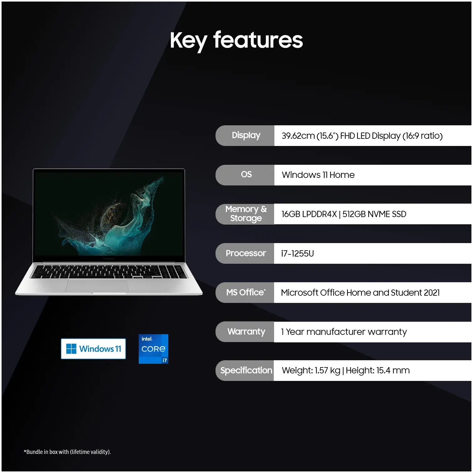 - Operating System: Windows 11 Home | Preinstalled Software: MS Office Home & Student 2021, Live Message, Live Wallpaper, McAfee Live Safe (Trial), Screen Recorder, Samsung Gallery, Samsung Flow, Samsung Notes, Samsung Recovery, Samsung Settings, Studio Plus, Samsung Update, Samsung Security, Quick Share, Galaxy Book Smart Switch
