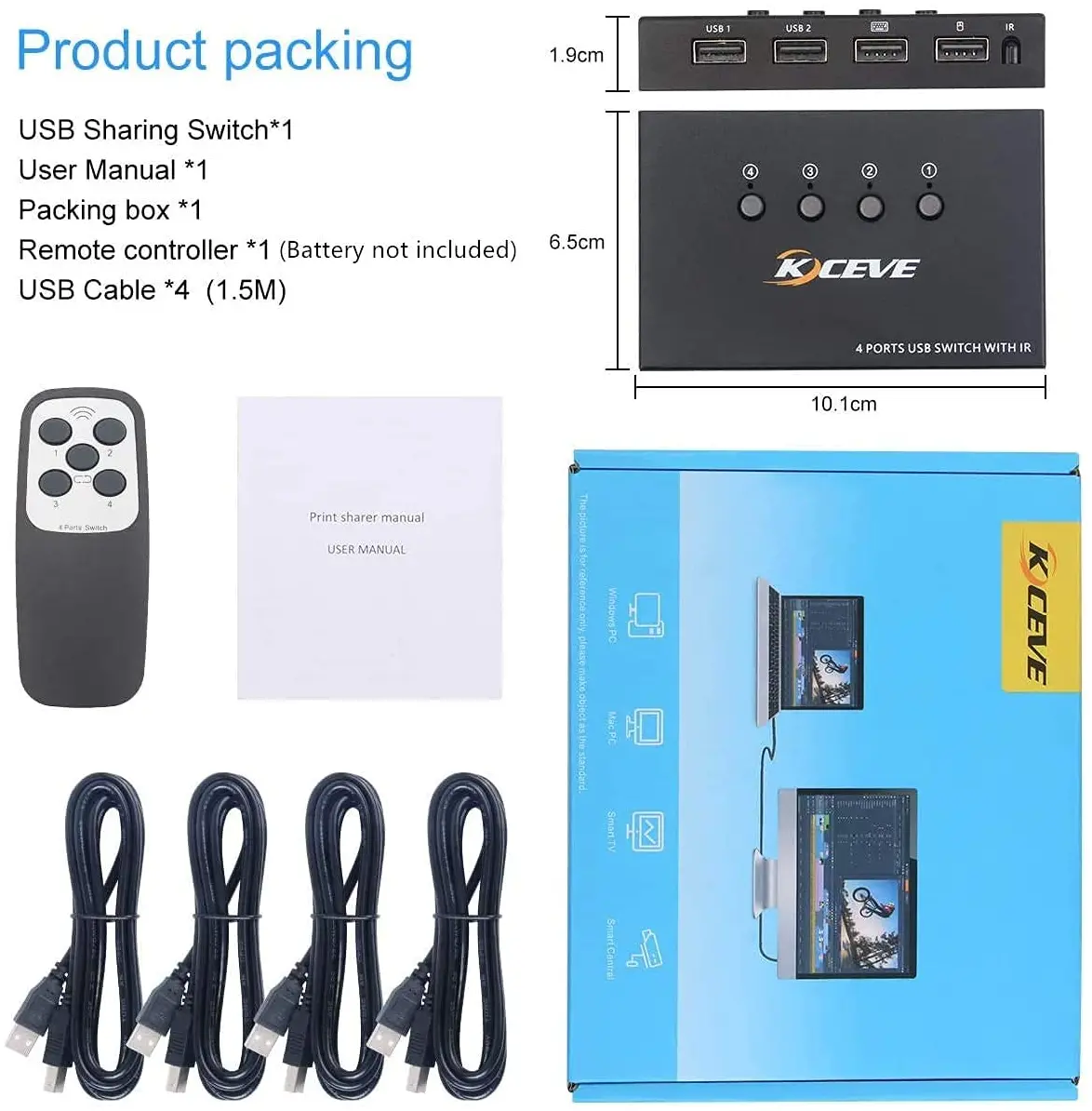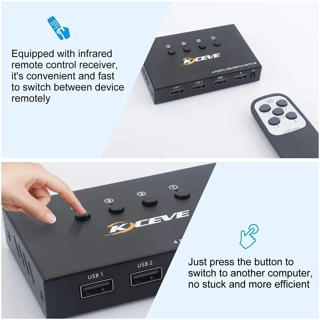 - Convenient switch way, support button switch and remote control switch way. The traditional USB switch is only with one button to switch to another host. But our USB switcher also support switched by remote control ( battery not included). Hotkey through keyboard not supported.