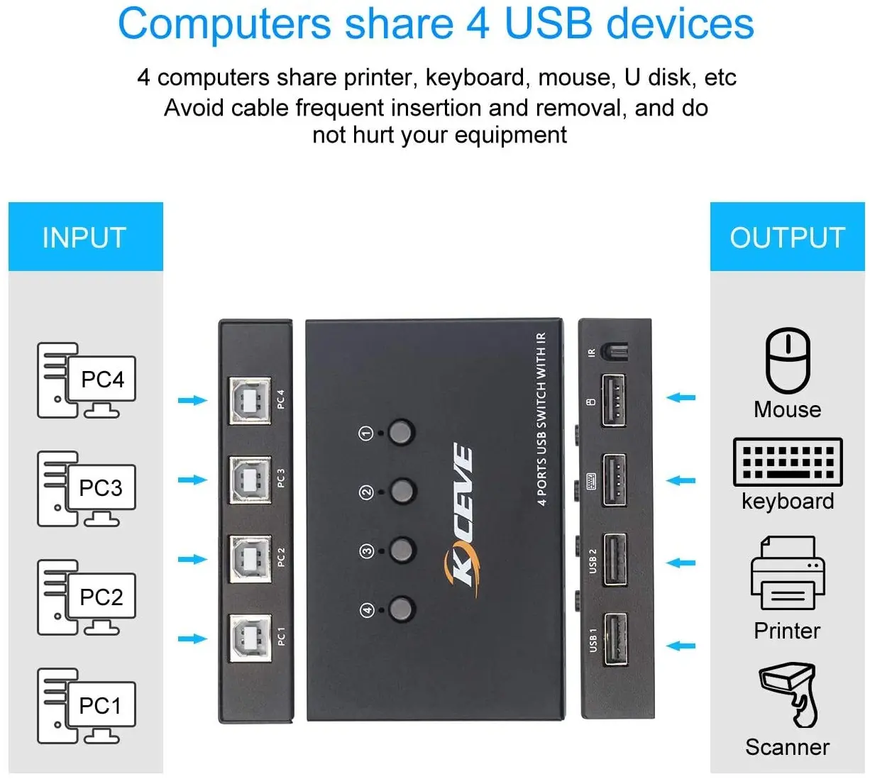 - This is a 4 in 4 out USB switch, allowing up to 4 users to share 4 USB 2.0 peripherals such as printer, scanner, mouse, keyboard or USB hard drive, etc. Yon don’t have to constantly swap cables when using our USB switcher. It’s great for use at home if you have multiple PCs or laptops. Note: this product can not share a monitor, if you need to share a monitor please buy the KVM switch model from our store.